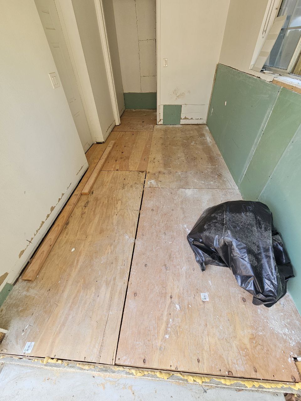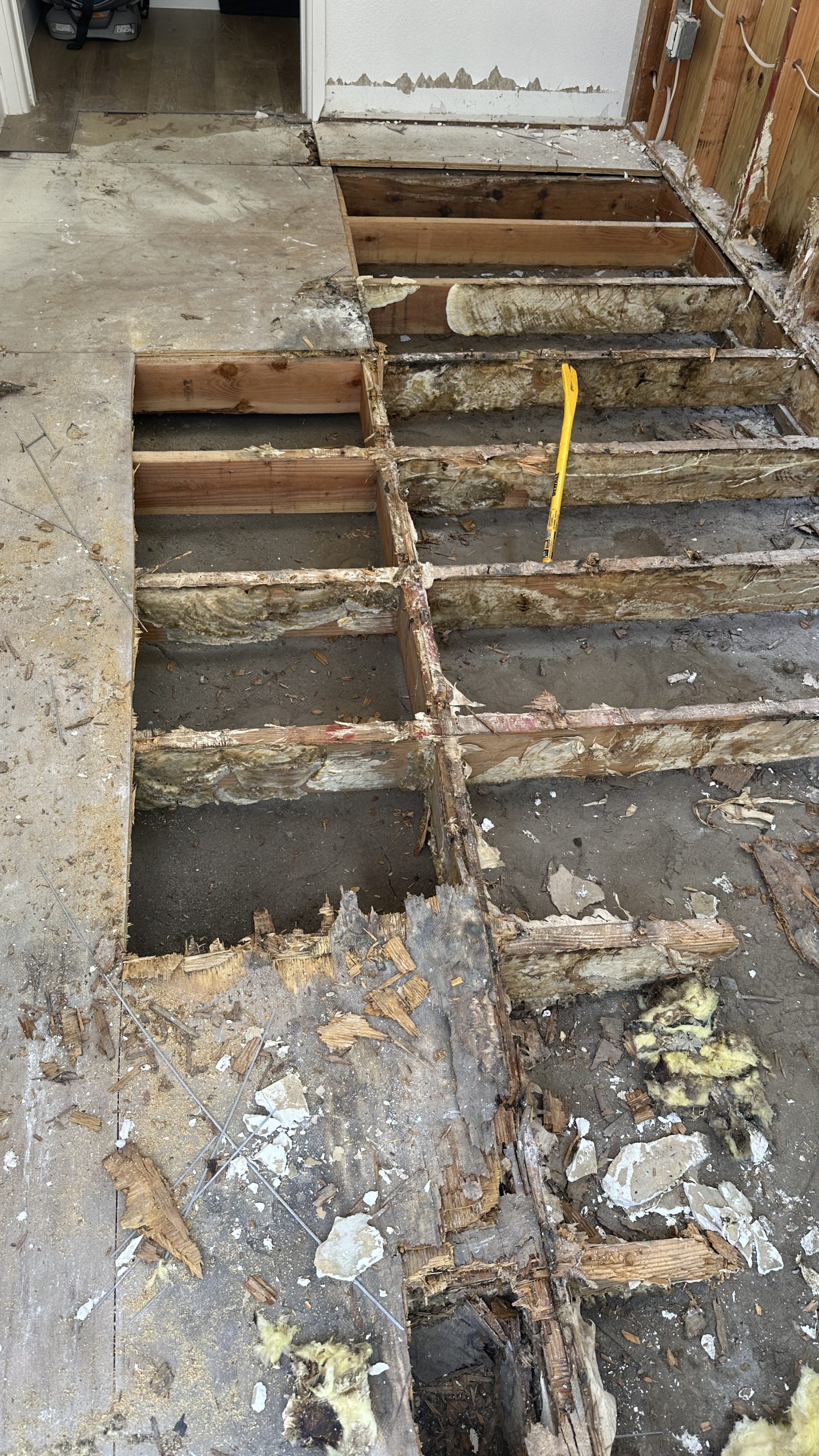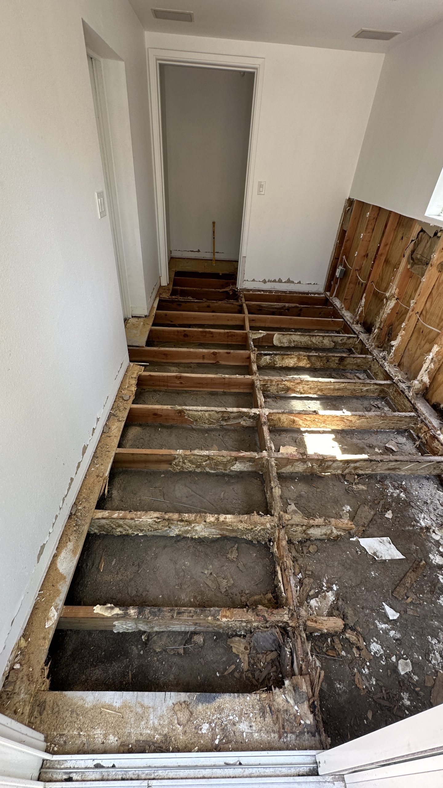 Complete transformation: from severe water damage to a fully restored and modernized room with new flooring.