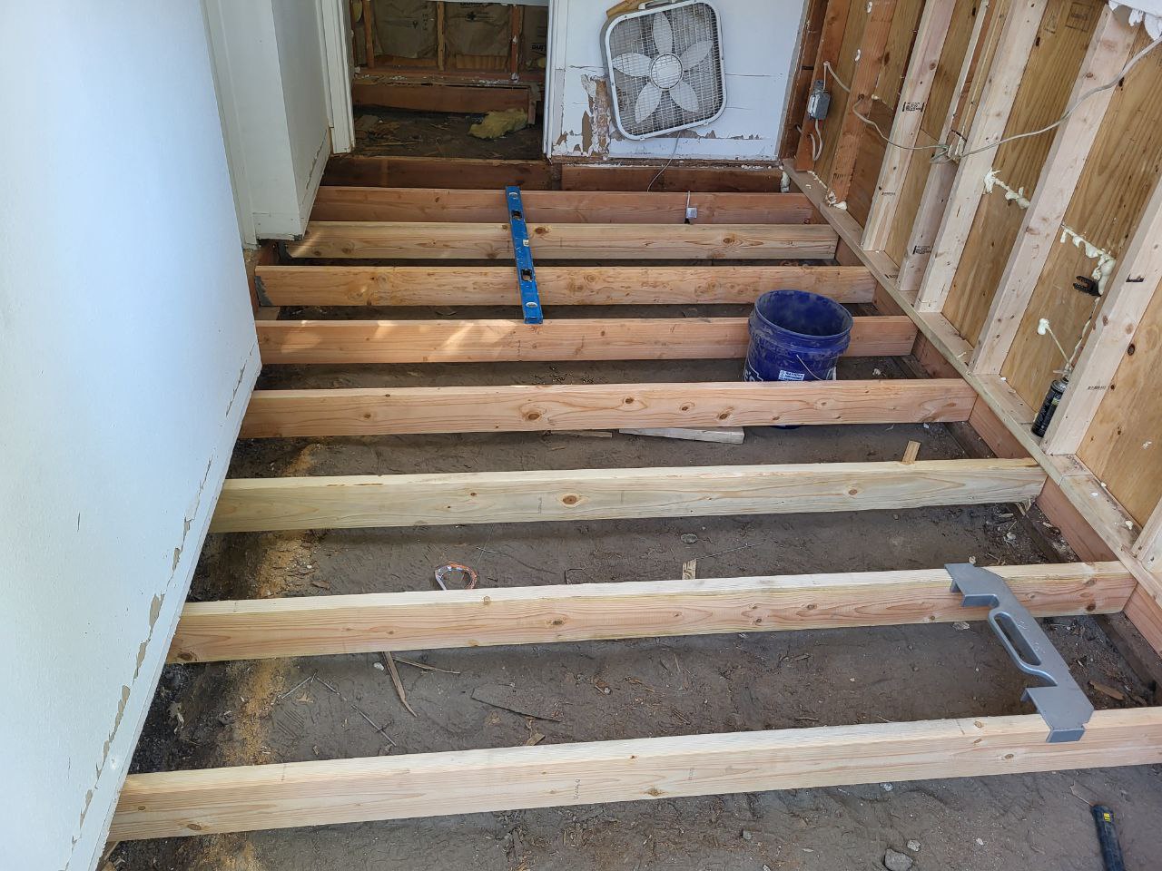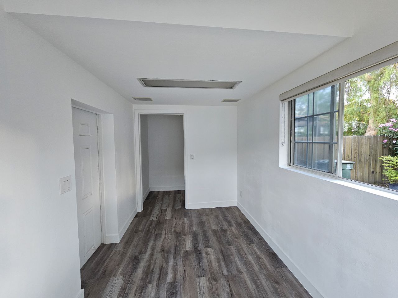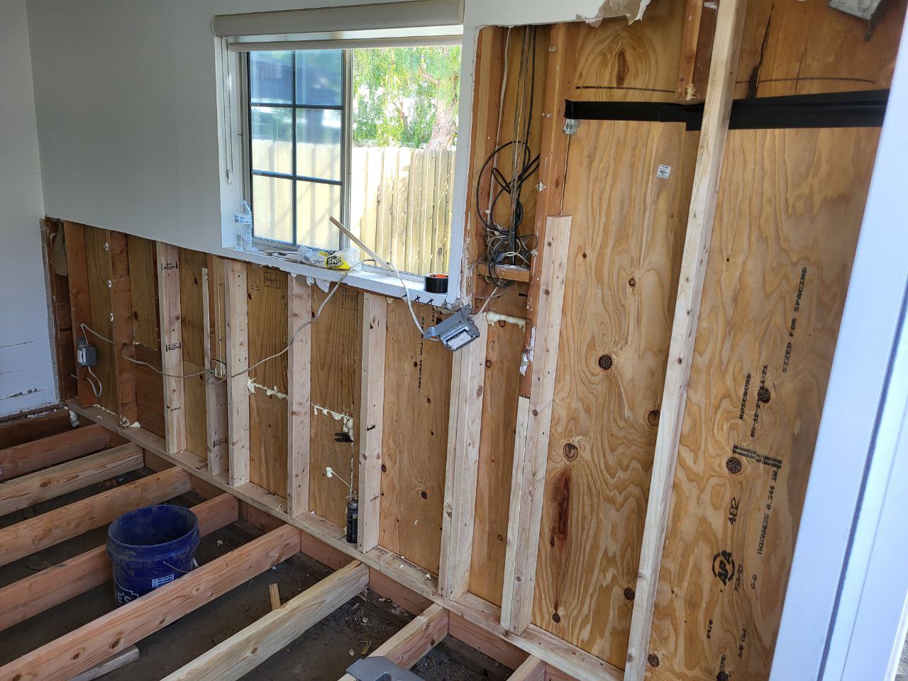 Complete transformation: from severe water damage to a fully restored and modernized room with new flooring.