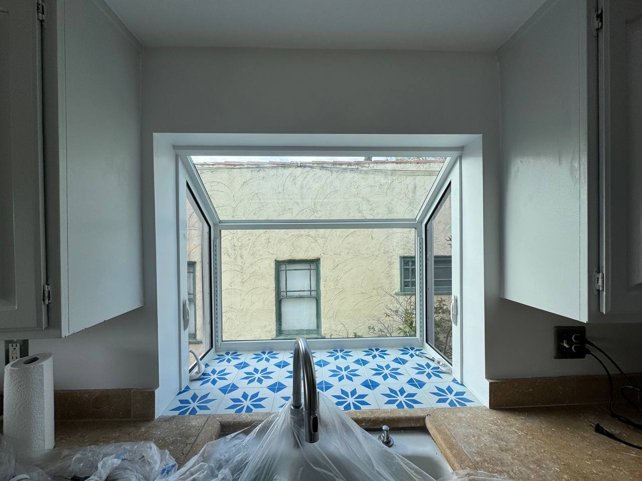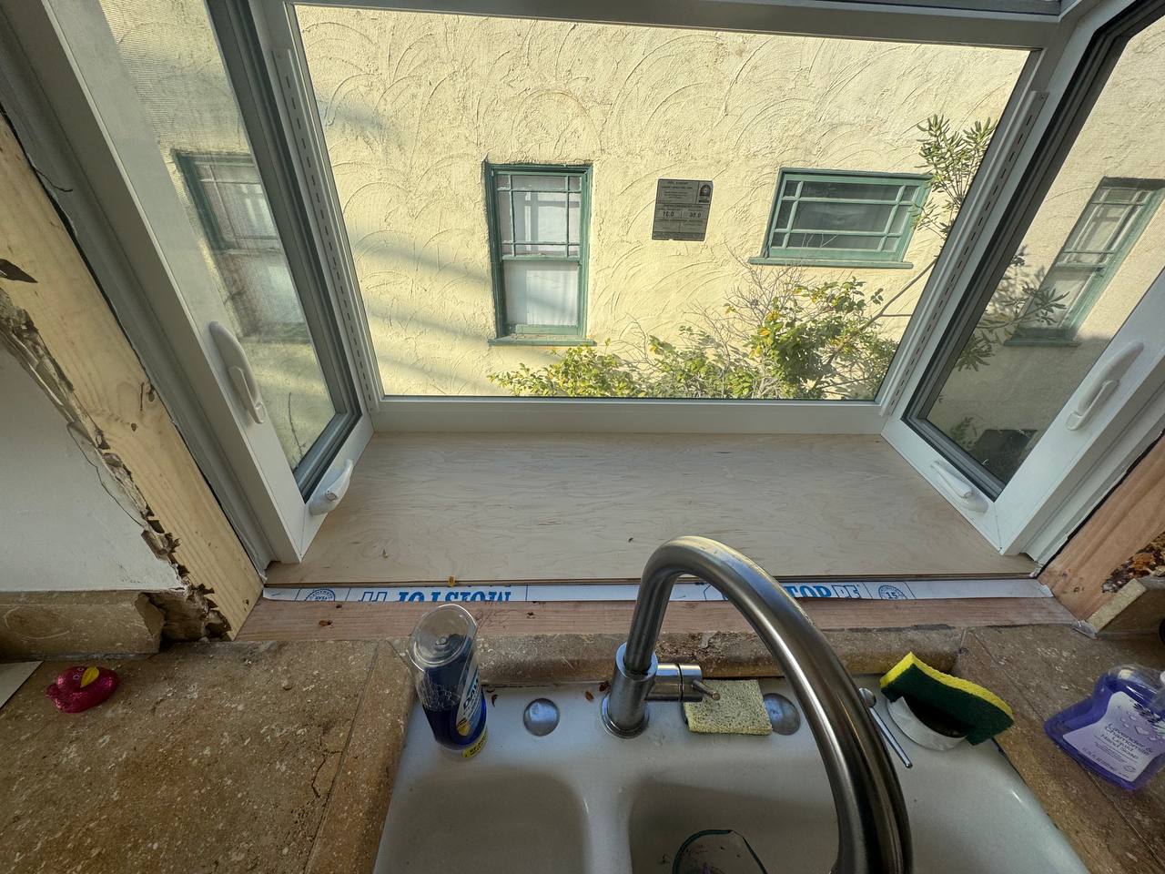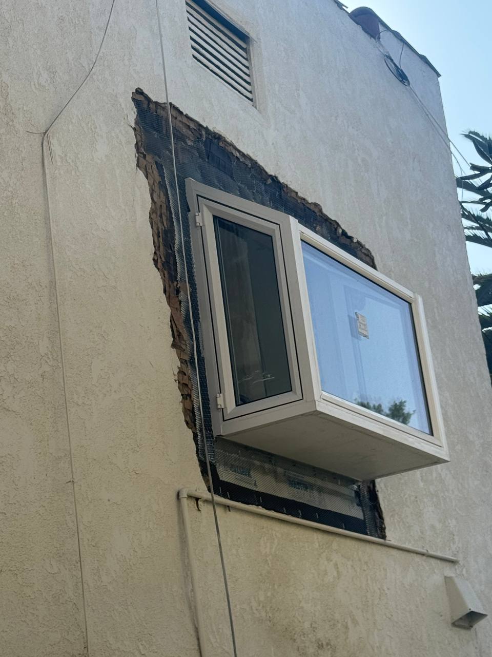 This stucco project involves repairing a damaged exterior wall around a window. From the inside, the project includes tile installation around the window area, ensuring proper waterproofing, alignment, and finishing for a clean and seamless look.